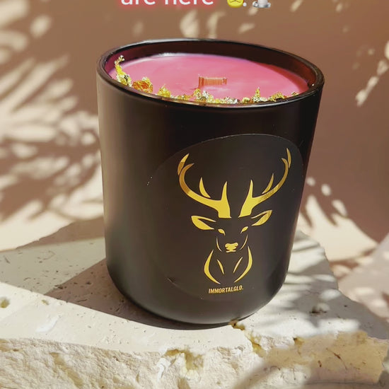 Our Christmas candles burn bright with creamy coconut-soy wax, a crackling wood wick and we generously add 24k gold flakes.